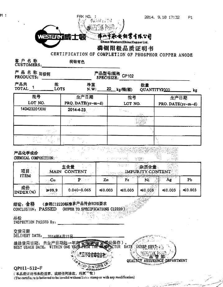 含    量:直徑25mm,銅含量99.9%以上,磷含量0.04-0.065%