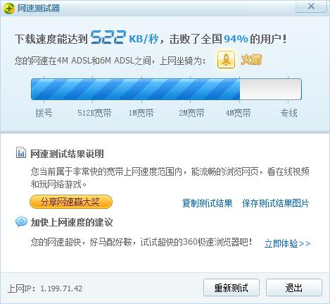 才4M的帶寬,360居然說我的網(wǎng)速是“火箭”級的,真是頭暈。我的幾個朋友,他們用的都是10M的寬帶,比我的強(qiáng)多了。