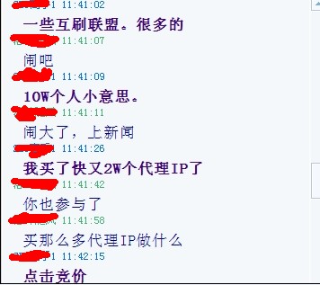 ![]() 圖片中的對話不是PS的,的確是真實的,百度官方聲稱“在我們的評估中,本次升級將會影響5%的搜索流量,此措施已經(jīng)生效”,我們在各大論壇,QQ群,站長網(wǎng)都會看到這樣的信息,5%的搜索量,已經(jīng)讓很多站長趴倒在地了,站起來需要很長時間。 隨著時間的推長,惡意點擊百度競價的站長也越來越多,目前已經(jīng)有人組成10w的站長參與此事,不惜成本和代價來引起百度的重視,下圖是今天早上和一位站長的聊天記錄。