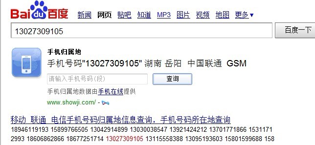 13027309105,這個手機(jī)號,給我的手機(jī)打電話,鈴聲響一下,感覺還不到一秒鐘,就掛了。 我又上百度查了一下這個手機(jī)號的地理位置,結(jié)果如下: