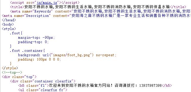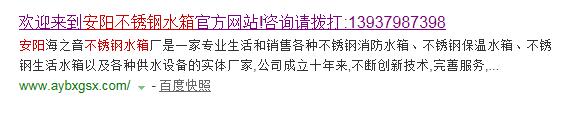 上面圖片顯示的是我的網(wǎng)站的百度快照信息,大標(biāo)題是“歡迎來到安陽(yáng)不銹鋼水箱官方網(wǎng)站!咨詢請(qǐng)撥打:.....” 而我的網(wǎng)站代碼中title標(biāo)簽中的內(nèi)容是: