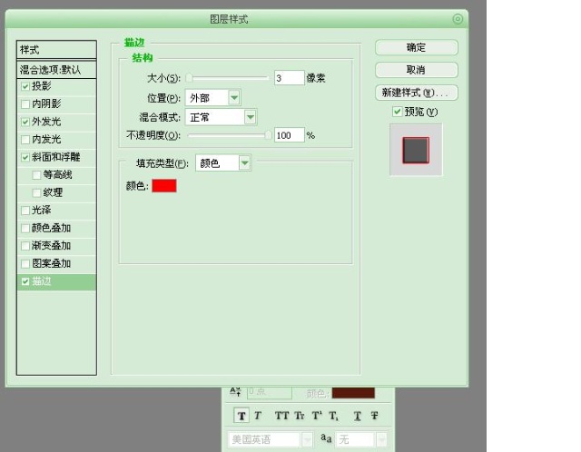 今天我選擇1、描邊,2、顏色:紅色,3、投影,4、外發(fā)光,5、斜面和浮雕,最后點擊確定。